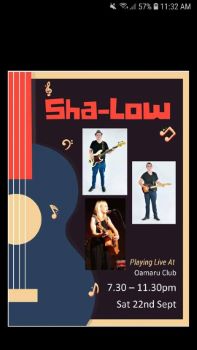 Join us at the Club this Saturday for a great night out with "Sha-Low" kicking off the show at 7.30pm, join us earlier for live Mitre 10 Cup action as Otago host Canterbury in Dunedin in the mainland derby, live and loud on the big screen, kick off 5.05pm, wear your colours.
