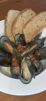 For a limited time, available Thursdays - Sundays, fantastic creamy garlic mussels with ciabatta bread, tastes extremely good with a cold Heineken or Pinot Gris, treat yourself today.