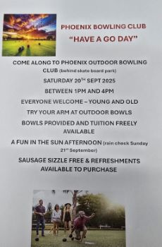 Phoenix Bowling Club invite Members and friends to come along to their HAVE A GO day which is on Saturday 20th of September between 1 and 4pm.