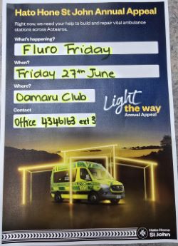 FLURO FRIDAY: 27 JUNE, we are supporting St John Oamaru to fundraise for their badly needed new station. We are hosting Fluro Friday starting 11am during the day so get your group together wear your fluro. Plenty of spot prizes, raffles, all proceeds go to the Oamaru rebuild. If you're not able to come and want to donate, please follow the link